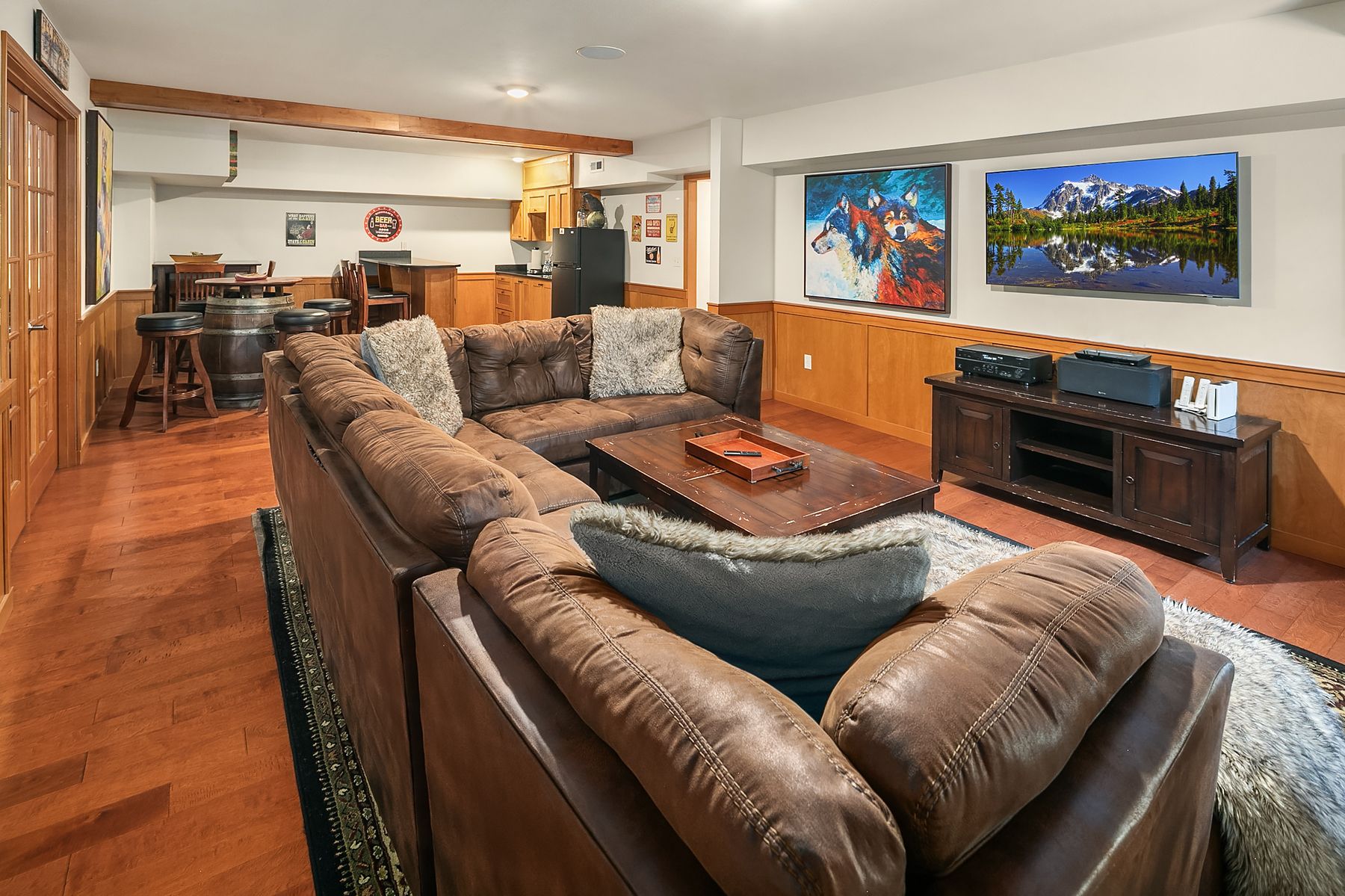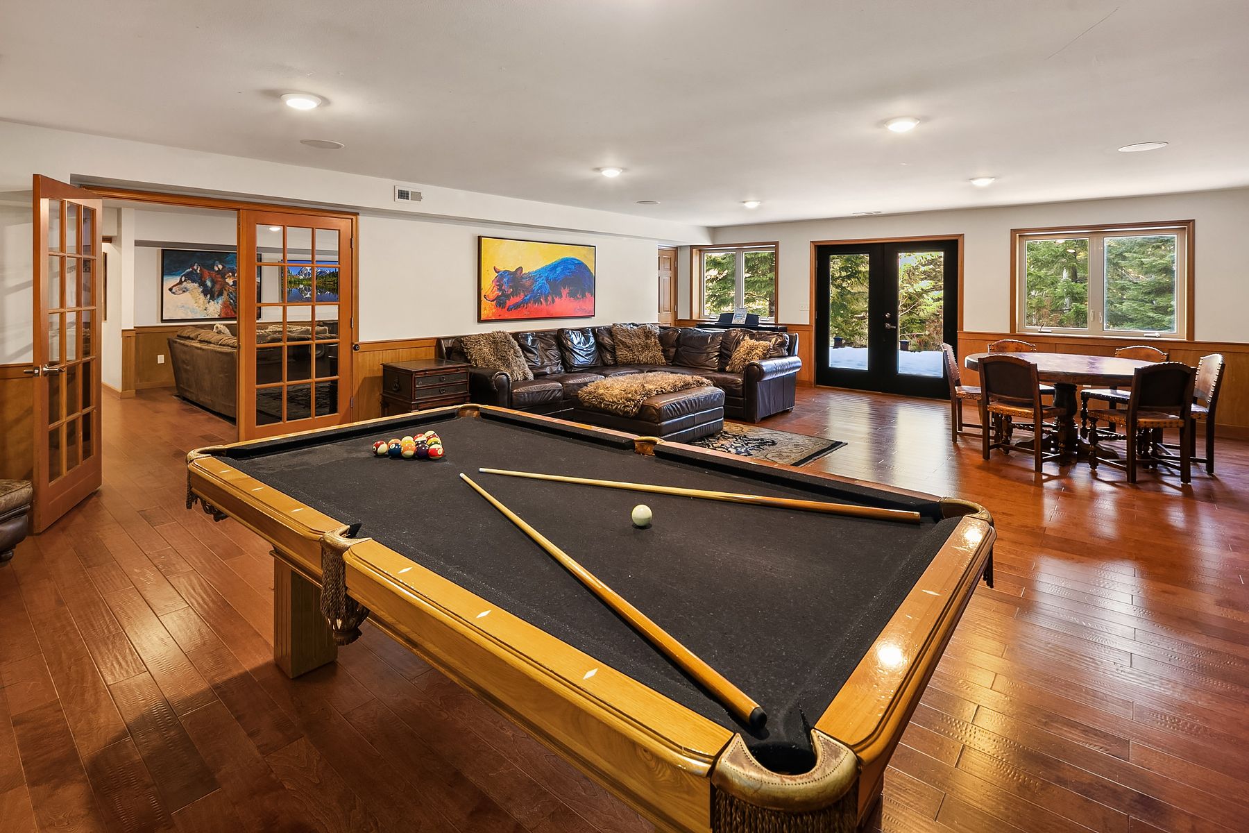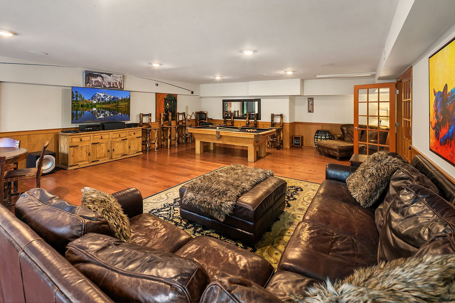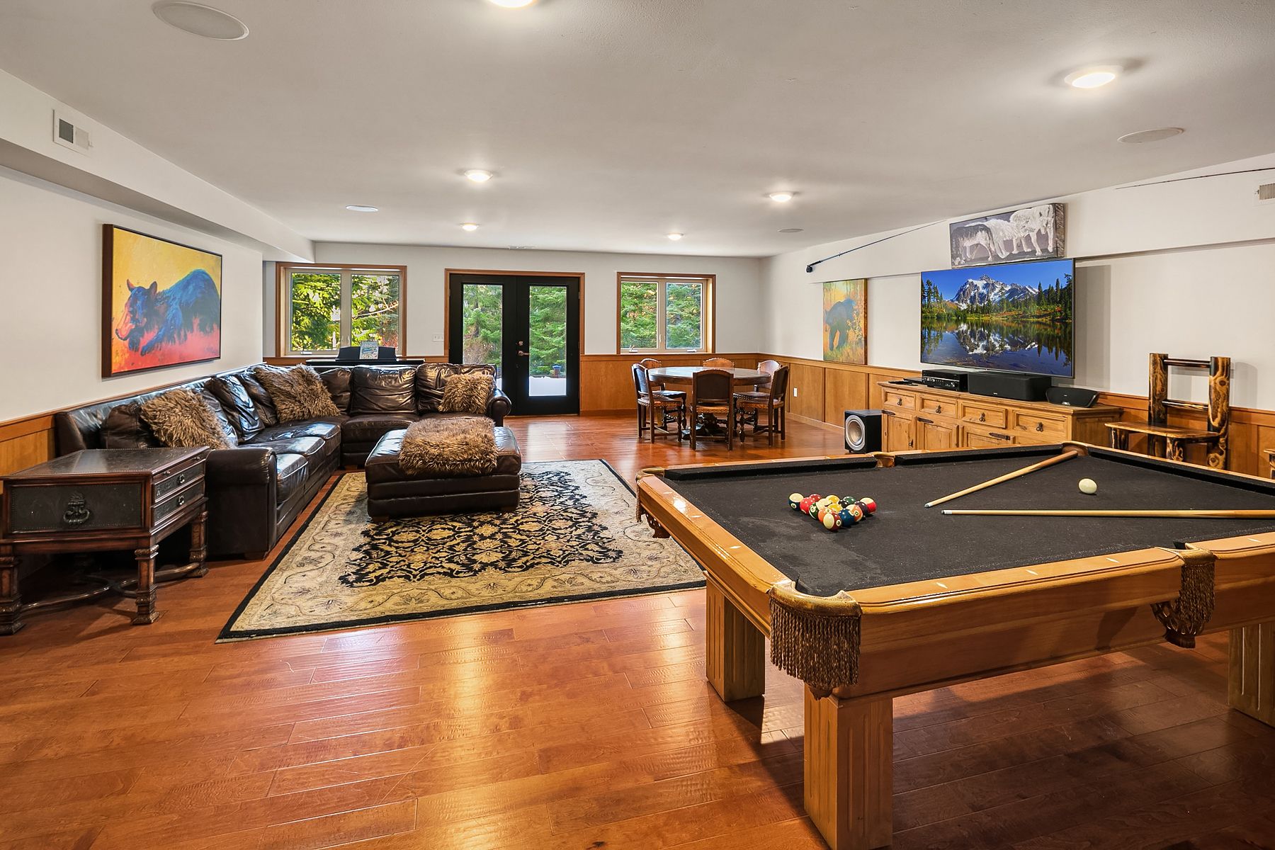 Lower Floor Bonus Room with a Large Flatscreen TV and Pool Table.