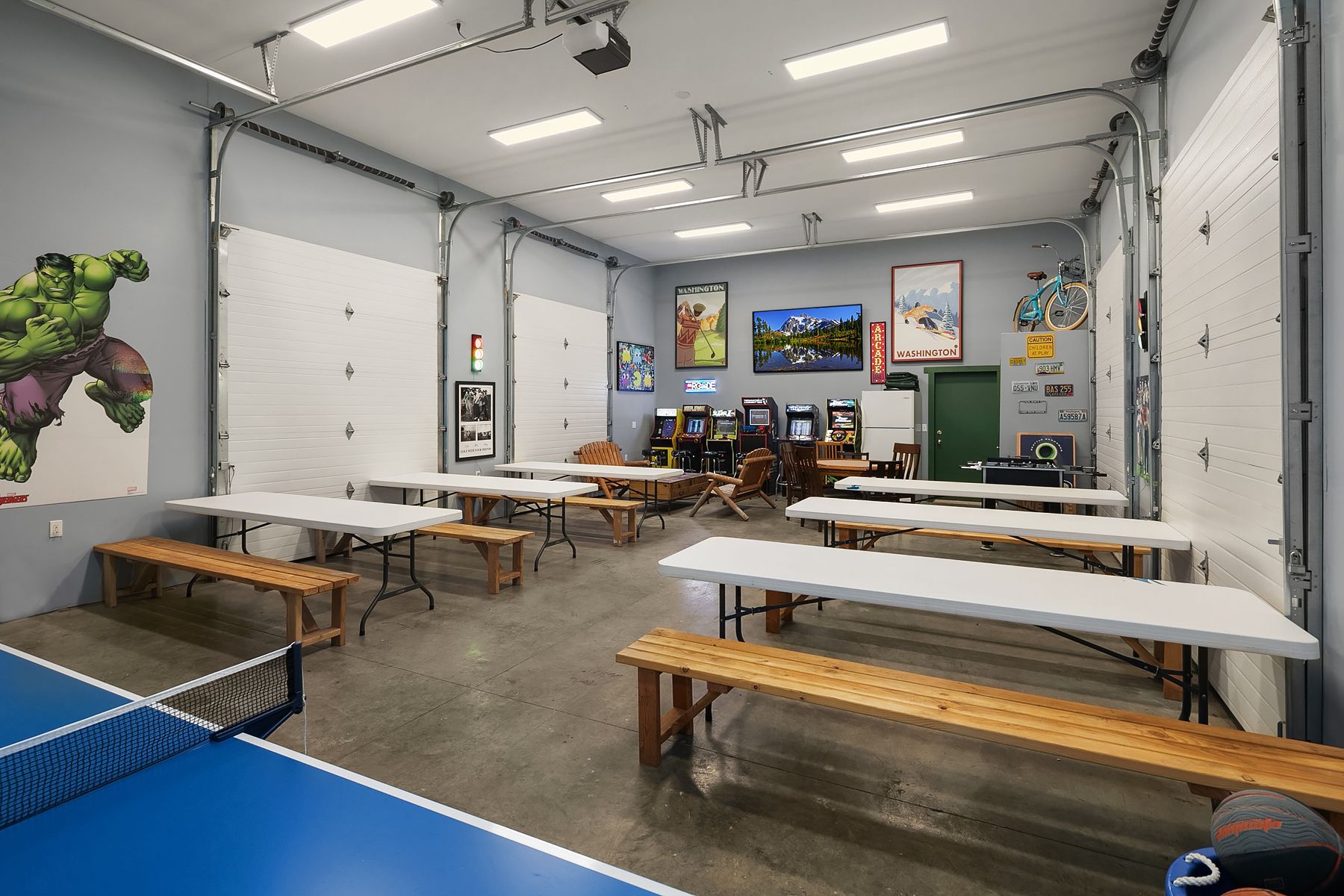 Garage game room set up in a meeting configuration. Great for corporate groups looking for a big space to meet. The garage game room has 2 heaters.