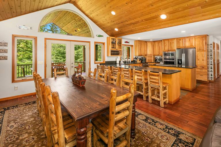 This sophisticated 4,800 sq ft home captures the essence of a "Cabin Get-Away", with charming cabin details and the privacy of the surrounding mountains and forests! The main cabin features a well-designed great room with vaulted ceilings, a gas river rock fireplace with leather seating, pine accents and other natural stones throughout for the ultimate cabin ambiance!
