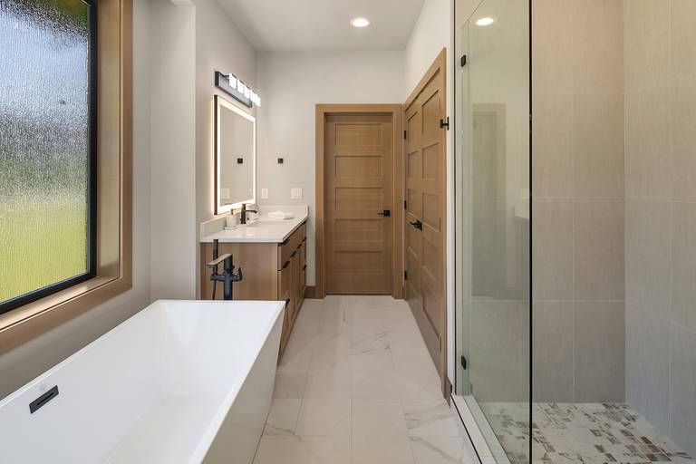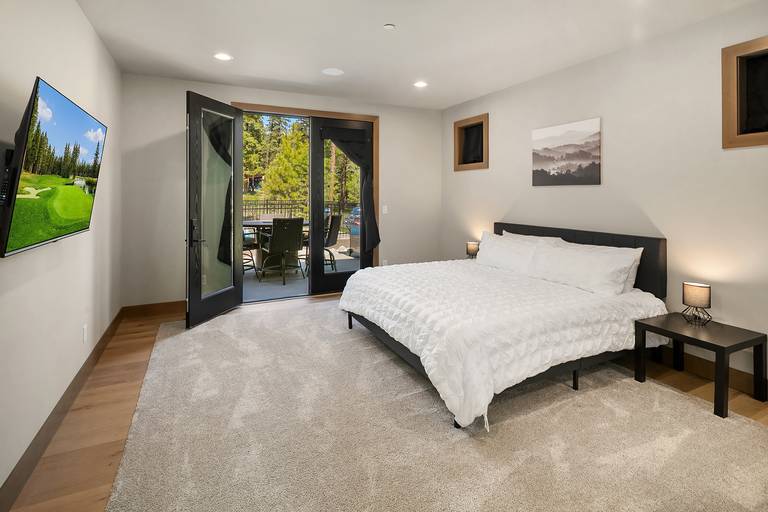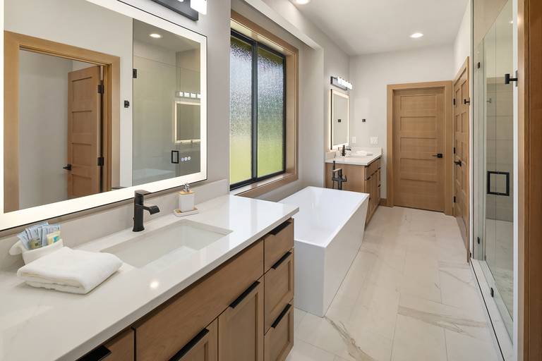 * The main floor master bedroom has a king bed and private en-suite bath with two sinks, a large soaking tub and a walk-in shower.