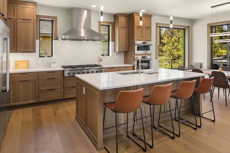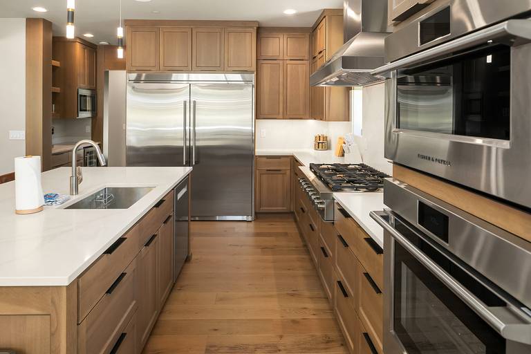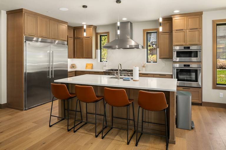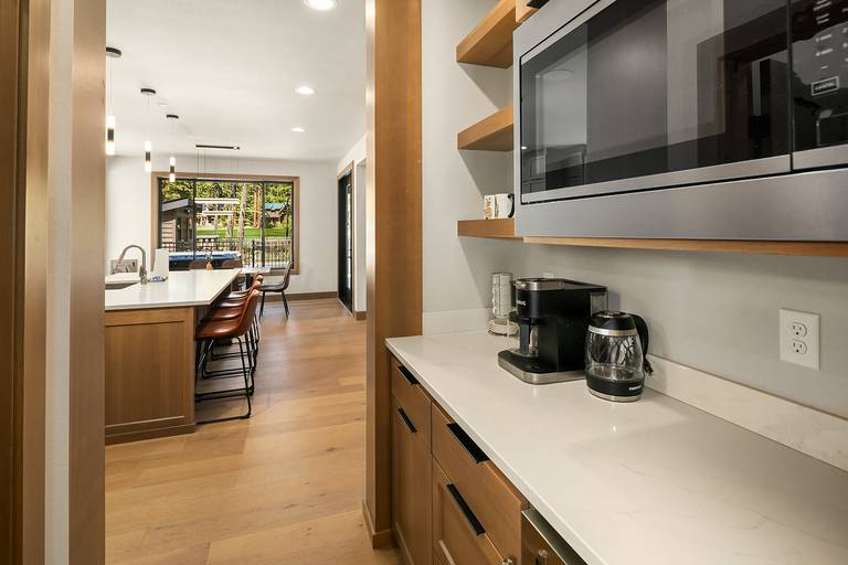 The fully stocked chef’s kitchen is ready to provide you everything you will need for fantastic family dinners or feeding a large group. The kitchen features stainless steel appliances, larger counter space and an oversized island prep area. There’s seating for 4 at the kitchen bar, and the large dining table seats 8.