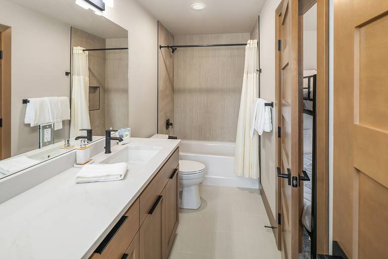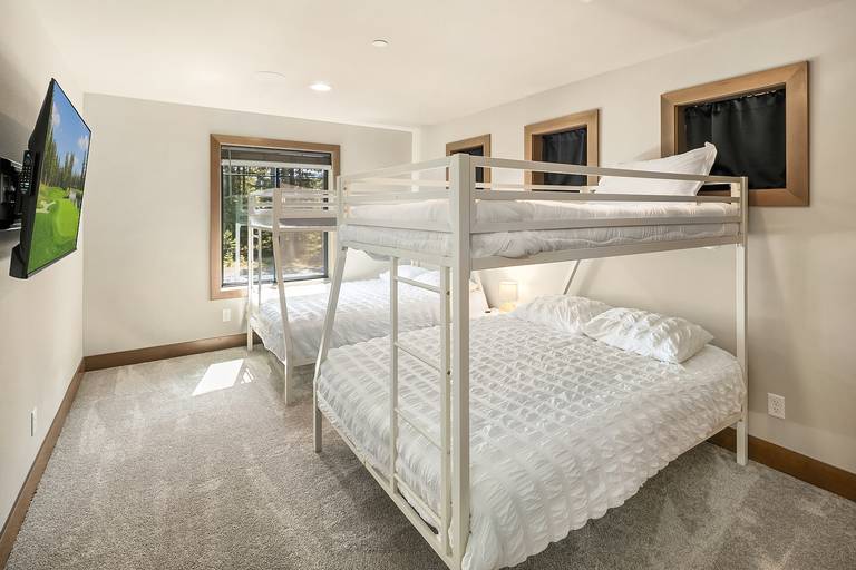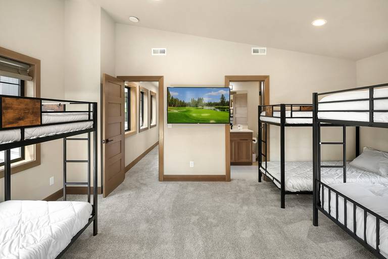 * 4th upper floor bedroom has 3 sets of twin/twin bunk beds, one queen/queen bunk and is supported by a jack-n-jill bathroom that connects with the king guest bedroom. The bathroom has a shower/tub combo.