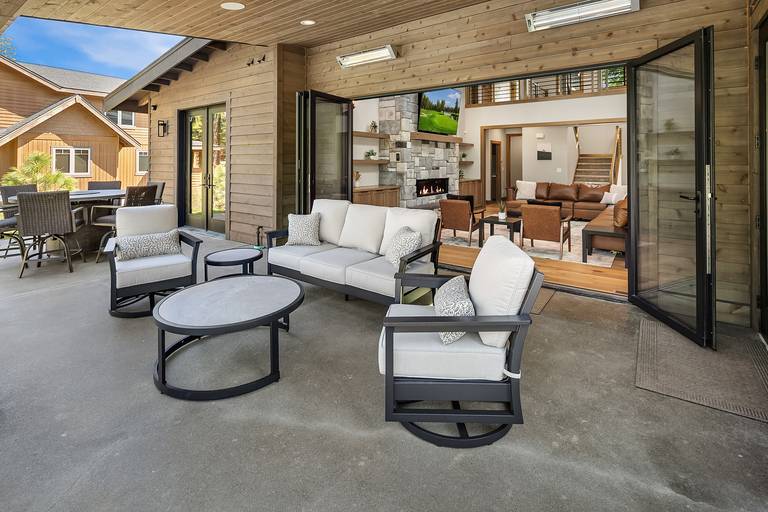 Just off the great room is a terrific entertainment patio that features a 16ft x 40ft private pool, a hot tub, gas fire pit, plenty of seating, an outdoor dining table, and a gas BBQ! The pool is heated to a fixed 85 degrees and is open from May 1st through September 30th.