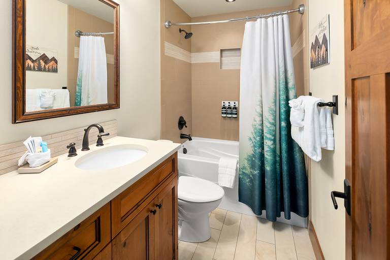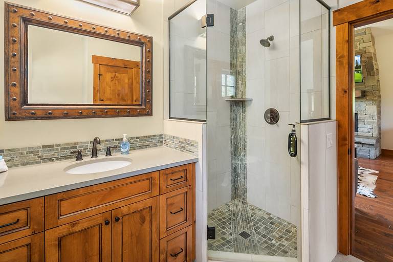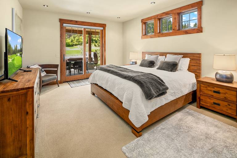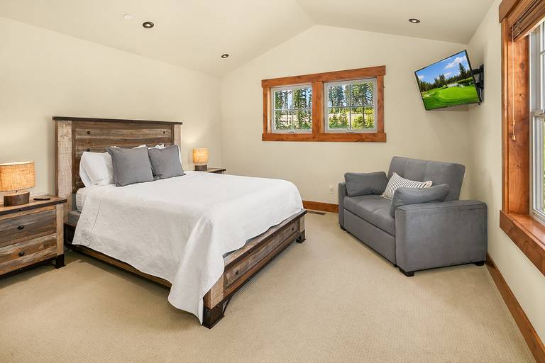 * The main floor guest master suite features a queen bed, smart TV, and a private en-suite bath with a shower.