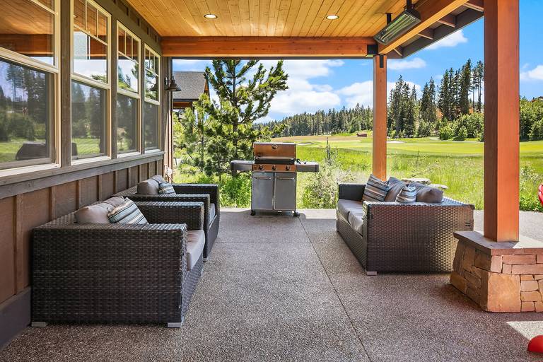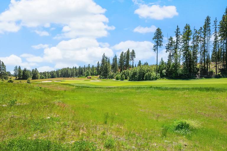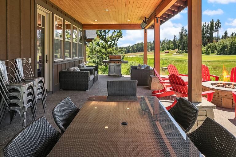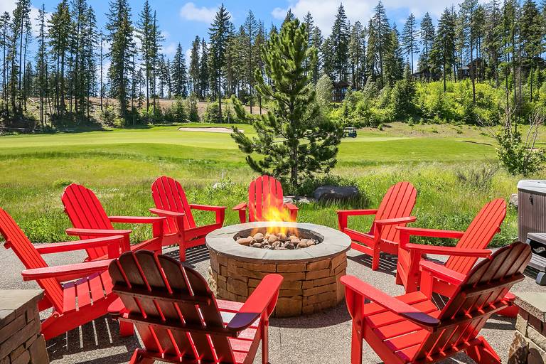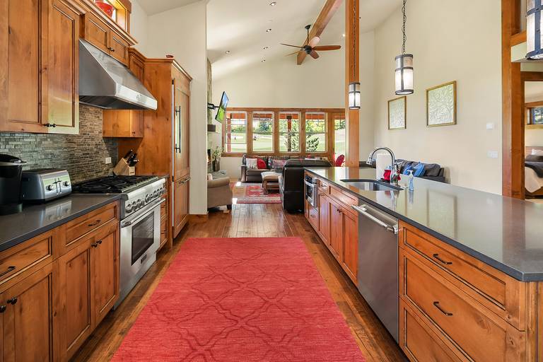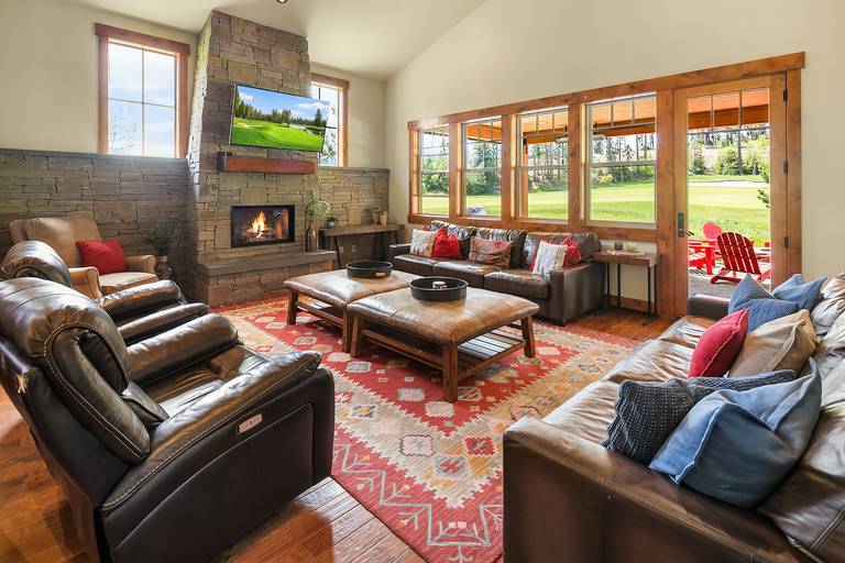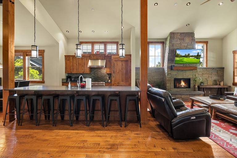 Vaulted ceilings, sleek hardwood floors, rustic wood beams, and a spacious open floor plan combine for a rustic-yet-modern feel. After you’ve unpacked, return to the living area to warm your toes by the fire while a movie plays on the flat-screen Smart TV. The kitchen comes fully equipped with stainless steel appliances, ample counter space, and a 6-person breakfast bar - so you’ll have everything you need to whip up your favorite recipes! If you like sun, this home is for you! Southern exposure on the 15th hole of the Rope Rider Golf Course.