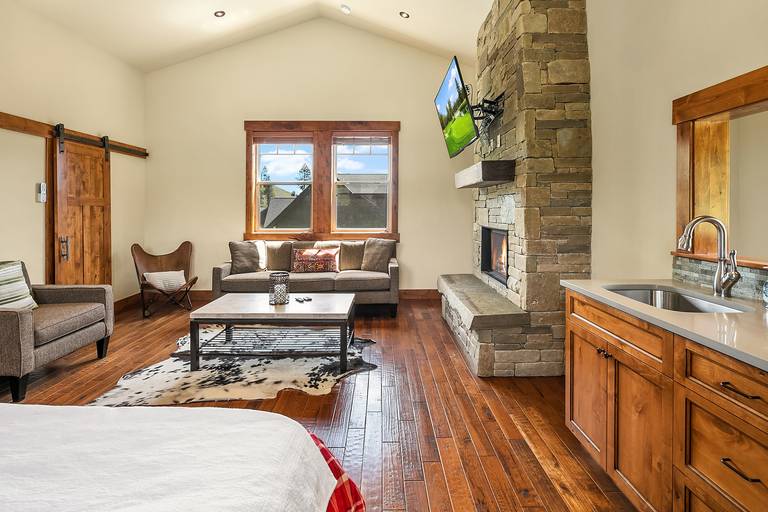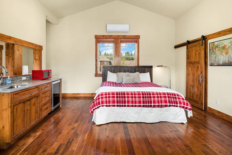 * The private guest apartment boasts a king bed, private bath w/shower, gas fireplace, large smart TV, and a min-bar with beverage fridge, sink and microwave.