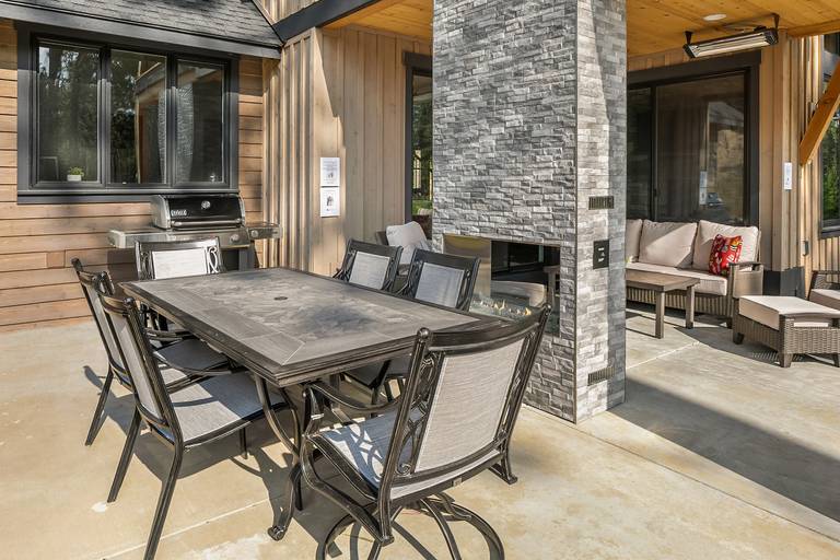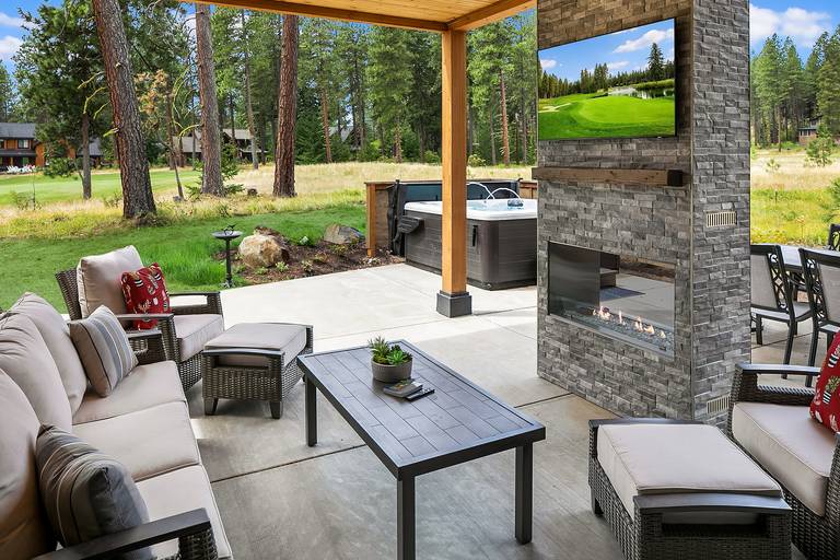 The fantastic outdoor living space was designed for relaxing and enjoying quality time with your friends and family. It boasts a covered lounge area featuring an outdoor TV and cozy gas fireplace. The patio also features a private hot tub, dining table for 6, a gas fire pit, and a stainless gas BBQ. Enjoy the panoramic golf course views as you sip on your favorite glass of wine around the fireplace!