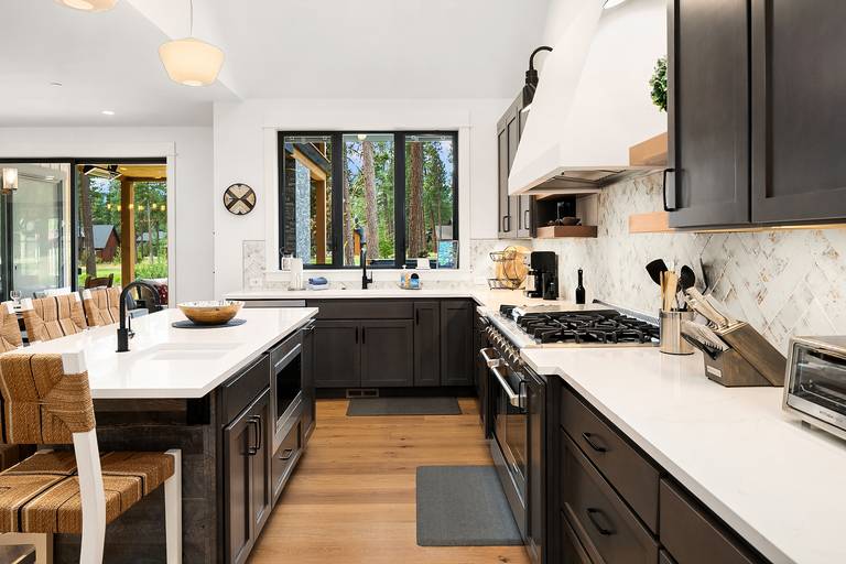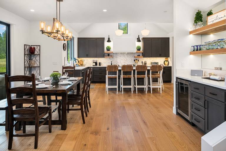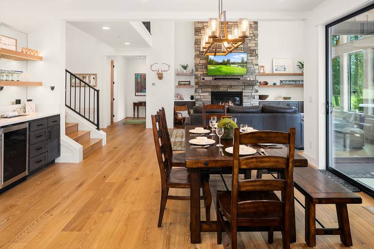 The fully stocked kitchen is ready to provide you everything you will need for fantastic family dinners or feeding a large group. It boasts stainless steel appliances, granite counters, and an oversized island prep area with seating for 5. The dining table is just steps away and seats 8 comfortably.