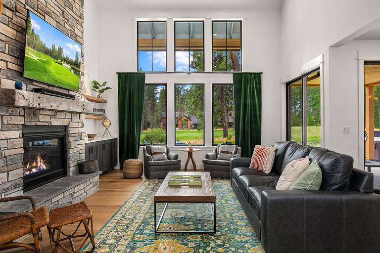 As you enter the home you’ll be greeted by a spacious, open-concept great room that opens up directly to the large outdoor entertainment area. The great room features comfortable leather furniture, a large smart TV, and a floor to ceiling ledgestone gas fireplace.