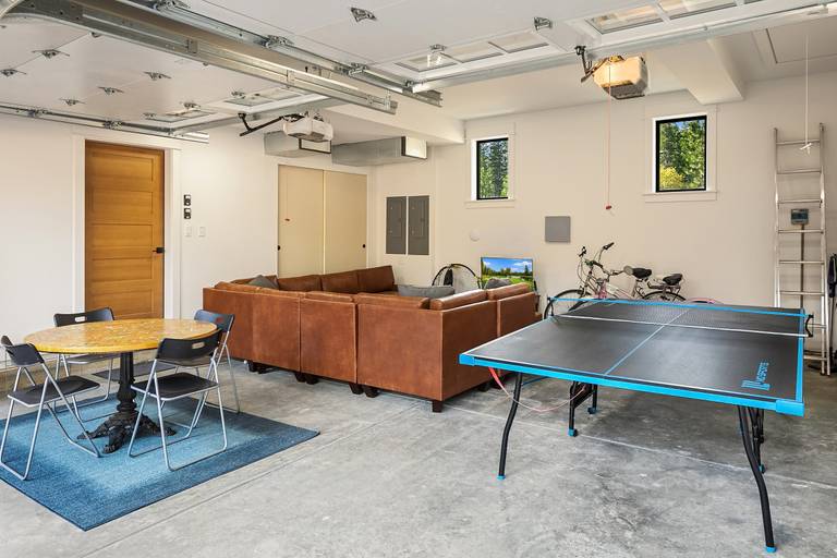 * Garage Game Room w/Couch, TV, Ping Pong Table, and a Card Table