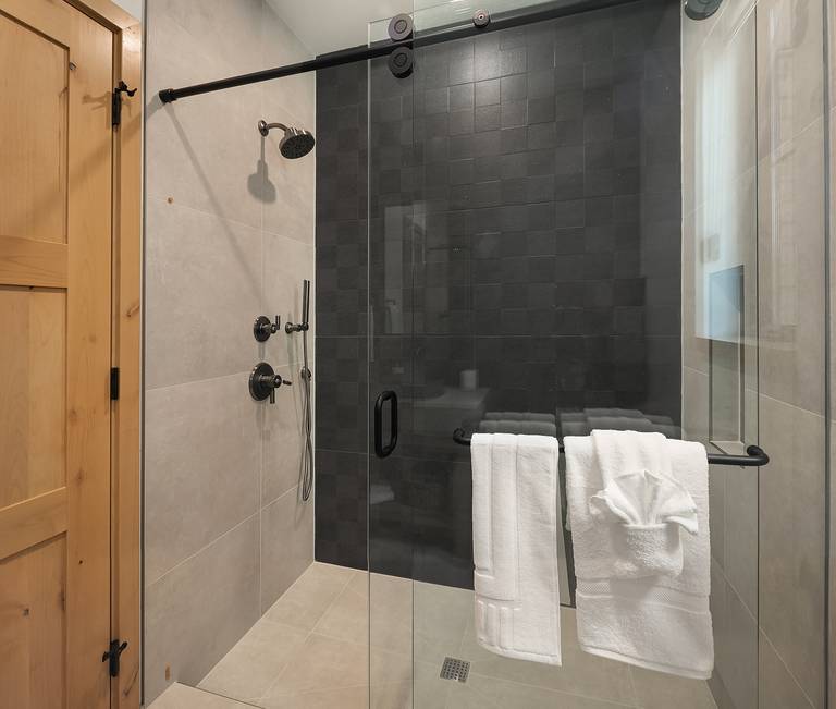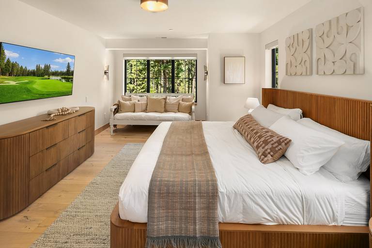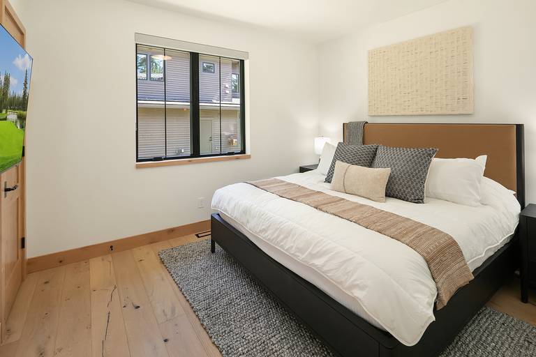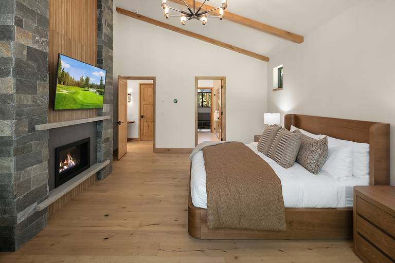 * The main floor guest bedroom has a king bed, TV, and a supporting full bath across the hallway with a walk-in shower.