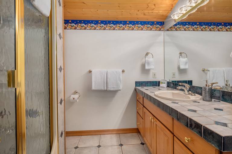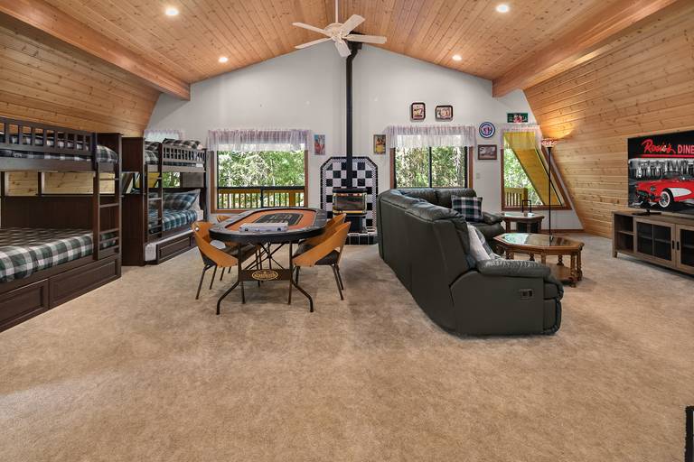 * The upper floor 50s Diner Bonus/bunk room has two sets of full/full bunks and a pull out twin trundle. This room is supported by a guest bath w/ a walk-in shower.