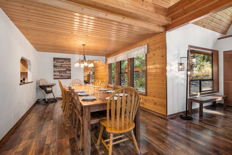 As soon as you walk through the front door, you’ll be greeted by a spacious and comfortable living room with soaring 30’ pine ceilings and a warm gas fireplace. Adjacent to the living room is the main kitchen and the dining area with seating for 14. Just outside the kitchen is a huge patio with outdoor dining for 12, and a large yard leading down to Silver Creek with a creekside fire pit. Just around the corner from the patio is a covered outdoor living space with comfortable outdoor seating and a private hot tub!