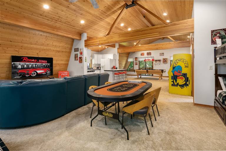 The huge 50s Diner bonus room is a great place for the family to relax and play games together. It features a 2nd kitchen, pool table, pin ball, poker table, leather couch, and a large TV w/FuboTV and Blu-Ray.
