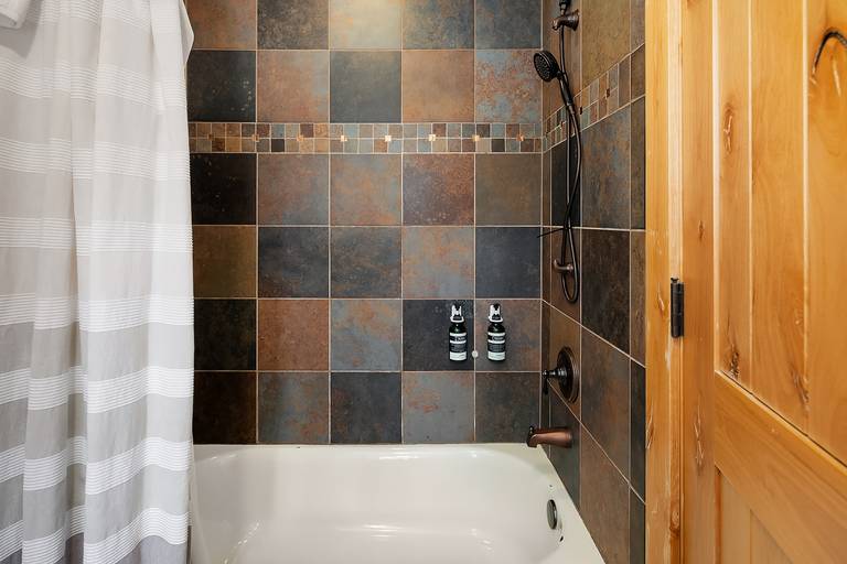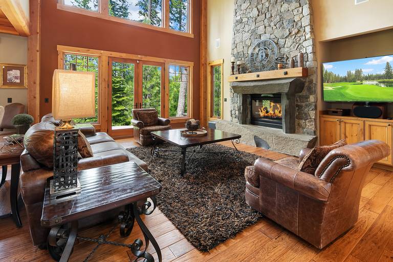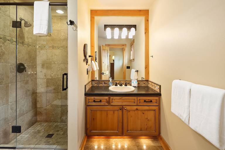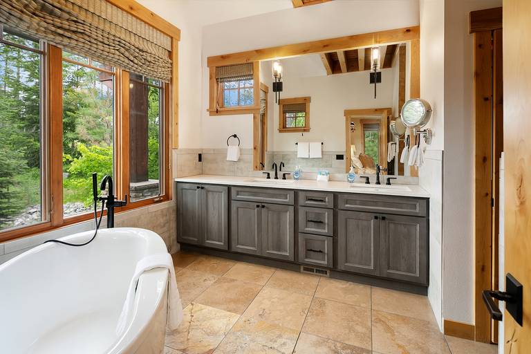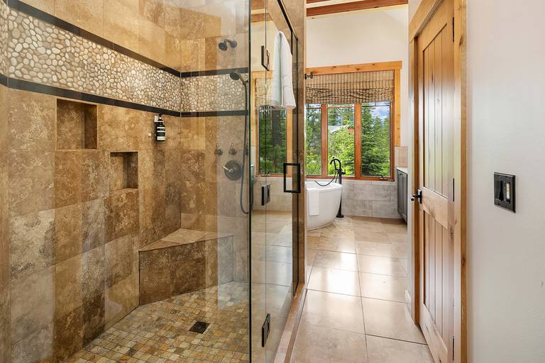 * The main floor master has a king size bed, gas fireplace, TV, and direct access to the back patio. The en-suite bath has a large soaking tub and huge walk-in tile shower with multiple heads.