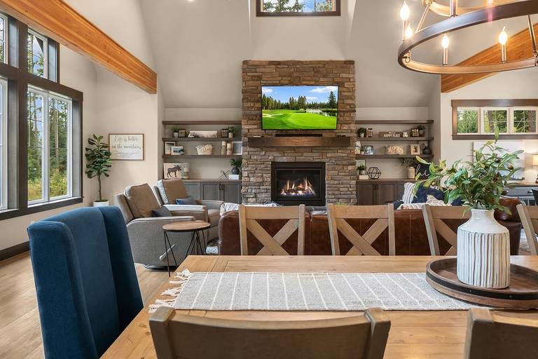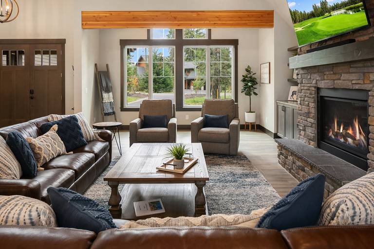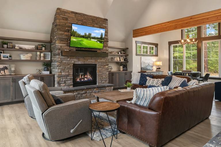 As you enter the home you’ll be inspired by the large, open-concept, great room with soaring ceilings, a gas ledgestone fireplace, comfortable couches, and a 70” Smart TV. This room opens up to the spacious covered patio boasting plenty of comfortable seating, a large private hot tub, gas fire pit, and a gas BBQ.