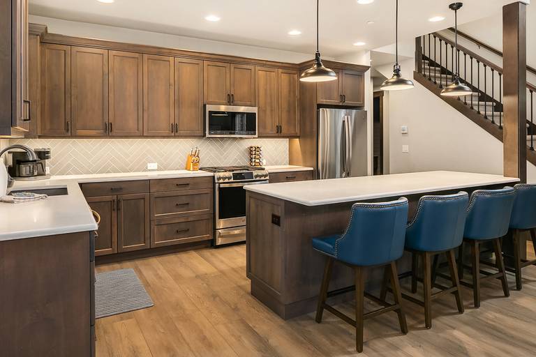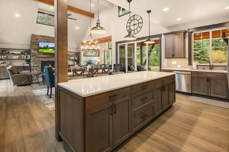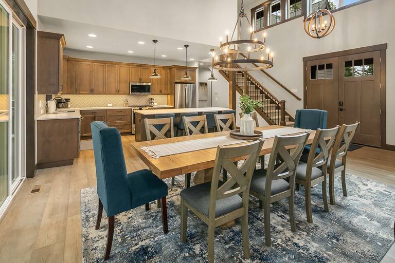The fully stocked kitchen is ready to provide you everything you will need for fantastic family dinners or feeding a large group. It boasts stainless steel appliances, granite counters, and an oversized island prep area with seating for 4. The large dining table is just steps away and seats 10 comfortably.