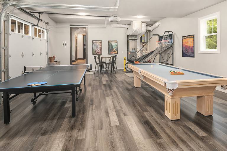 * Heated Garage Game Room with a Pool Table, Ping Pong, Pop-o-Shot, and a bar table!