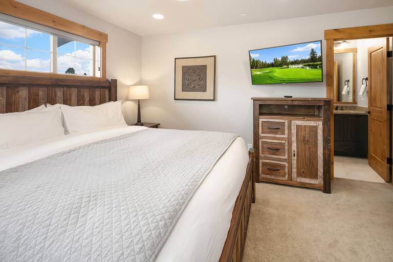 * 1st upper floor bedroom features a king bed, a Smart TV and a private en-suite bath with dual sinks and a walk-in shower.